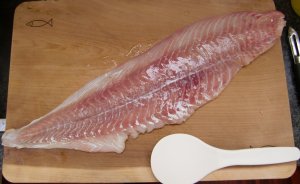 Seelachs と書いてあるけど いまいち何だかわからないまま 家に帰って辞書を見ると「たら」だそうです。ほんと??? なにしろ やたらにでっかい。まな板をはみ出しそう。