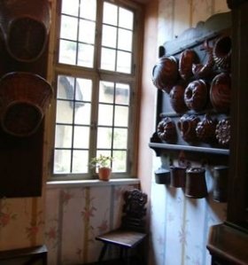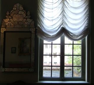 左の2つはゲーテハウスの窓。台所は中庭から入ったすぐ横にあって下の階の裏だから、冬はかなり暗くなるのでしょう。こんなに縦長な窓をつけて、ちょっとでも光のあるときは もらさず取り入れようとがんばってるんだなあーと感動。階上にある部屋は窓の横に鏡が配置されて、昔っぽくて優雅でした。