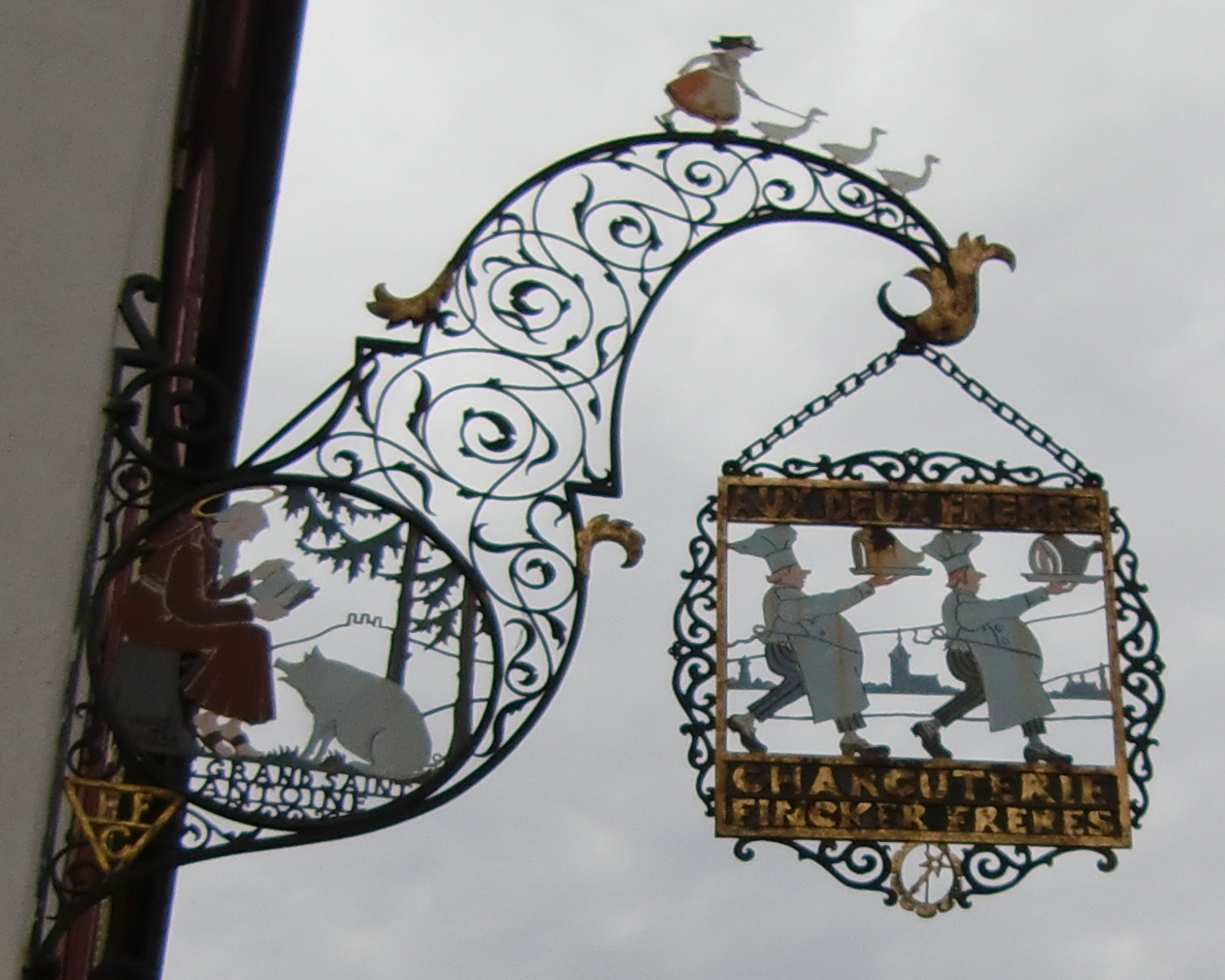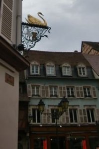 スワンの看板の出てるところは薬局、肉やさんの看板の出てる建物は洋服やさんでした。’Aux deux frères Charcuterie’「二人の兄弟肉店」と書いてあって豚やガチョウもいるのにね!