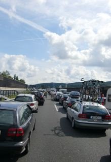 Je croyais que des embouteillages étaient chose rare en Europe…. mais NON! Ça arrive très souvent, surtout sur de grands axes, en plus avec des départs en vacances et des camping-cars (très souvent hollandaises)…