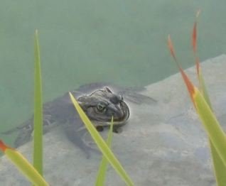 アマガエルたちの住処の蓮の池には、もっと大きな貫禄ある蛙の大姉御が! 虫の音が聞こえる夕方 しずしずとお出ましになり、プールのまんなかを泳いでいました。