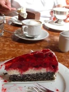 今回は、大きなカフェのあちらの端のほうにあるケースにいろんな種類が飾られているのを見に行って、名前がHimbeer Topfen Torte(フランボワーズ チーズ ケーキ)であることをしっかり確認。‘Himbeer Topfen Torte bitte!’ とオーダーできました。(見かけから言ったって明らかに観光客なんだからね、しかしがんばっているsachanにやさしいボーイさんはちゃんと微笑みとドイツ語で答えてくれましたよ。初心者気分で満足なsachan・・・)