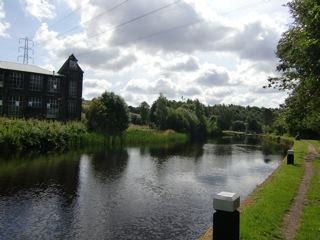 マンチェスタの北の郊外のロッチデールRochdaleのホテル(←披露宴会場)から、東の内陸へ低い丘陵が連なっているほうへドライブに連れて行ってもらいました。ランカシャーからヨークシャーへ向かう境目です。途中、石づくりのテラスハウス(2階もしくは3階立ての家が3つ4つとつながっている建物。日本で言う「長屋」みたいなものかな)の並ぶ町を抜けていくと、幅の狭い運河がうねりながら続いているのが見えます。そして運河沿いに工場のような建物が散在しています。