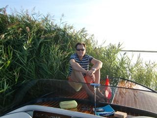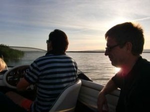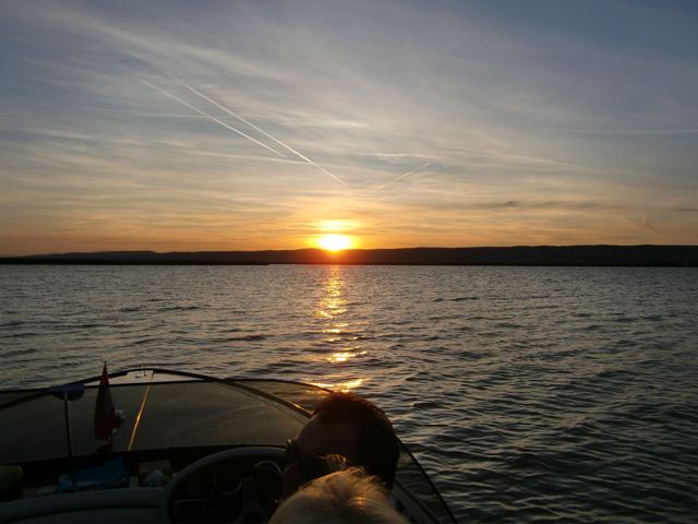 今週は友人のFritz(no.1)の親友のFritz (no.2)のボートで、ノイジーデル湖に夕暮れの散歩に連れて行ってもらいました。(舟で散歩というかなあ・・・でも他のことばが見つかりません) この二人はかなり旧い友達で、奥さんどうしもとても仲良し。同じBreitenbrunnに住んでいます。家人は二人を区別するために「no.1とno.2」と言っています。no1のほうは私たちが現在 居候させてもらってるうちのおじさんで、no.2のほうはベテランパイロット。テイーンエイジャーから8歳まで3人の子供のいるお父さんです(sachanと同じ年であると判明した)。「仕事を早めに切り上げて帰ってくるからボートで出かけよう」と提案してくれました。
