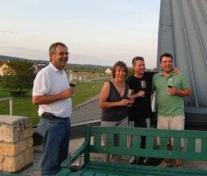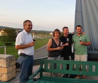 A la fin de la dégustation, on est tous montés sur la terrasse qui donne sur les collines Hügelland, d’ou viennent les raisins. Le soleil se couchait derrière l’église du village, de l’air si pur et on voyait des cyclistes filer dans les champs.