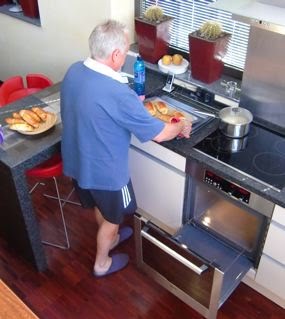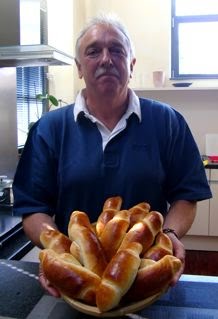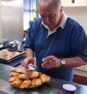 Aujourd’hui, c’est la xième confection. Moi je m’occupe de préparer la pâte, de la faire lever et de les former et Bernie s’occupe de la dernière étape de mettre de l’oeuf sur la pâte avant de les cuire, les surveiller (c’est juste 15 mn) et de les sortir du four… Ça sent très bon et il est super heureux … et fier de se charger de cette dernière étape, comme vous pouvez le constater !