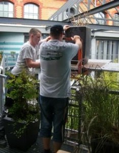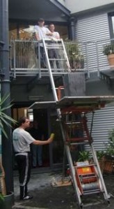 Les adorables 4 mecs sont venus travailler … et quelle efficacité! Ils ont démonté le reste des meubles en petites pièces, ils ont mis une sorte d’ascenseur pour descendre cartons, meubles et plantes.