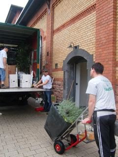 2階から下に降ろすものがかなりあったので、中庭に「エレベータ」が設置されて、外のトラックに次々に積み込まれ → 最後に植物を全部入れて →「じゃー現地であさって、また!」と出発。