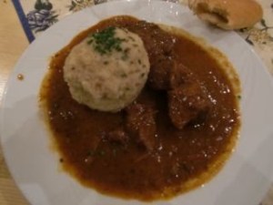 sachanが選んだのは「グーラッシュ」牛肉の煮込み料理で、クヌーデルというパンの団子みたいなものがついています。大きさが大人のゲンコツぐらいwwwじゃがいもなんか「ぶっとぶ」ぐらい、どーんと胃袋にきます。・・・格闘の結果 やっとこさ半分食べましたが、ギブアップ。こういうものが出てくるたびに全部食べてたら、いくらダイエットしても追っ付かないよー!!! でも煮込みは美味しかったです。ごちそうさまー