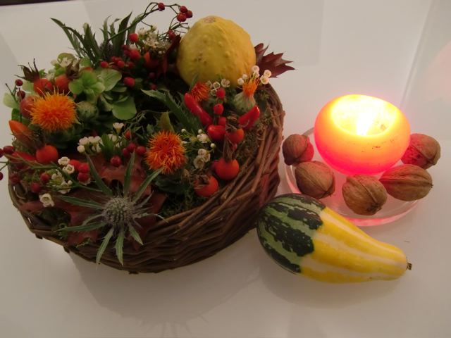 Elle me dit qu’après le 20 novembre, quand celles-ci seront finies, elle pourra préparer quelque chose pour l’Advent, en utilisant le même panier. L’idée me plaît beaucoup!!  … surtout que tous mes vases de fleurs sont encore dans les cartons, en attendant que la cuisine sera installée début décembre (… enfin c’est prévu, mais on verra si ça se réalise suivant le plan… ce serait bien que je puisse un peu mieux cuisiner pour les fêtes de fin d’année!)