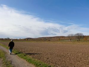 丘の麓にワイン畑や休耕地が広がる、のどかな景色。鳥が畑で何かをついばんでいます。空は高く青く広がってるし、空気は澄んでるし、うしろを振り返れば村が広がる向こうに湖の水面が白く光って見えています。