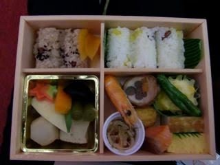 夕飯がわりのお弁当も日本の味。こんな小さな四角のなかに、違う味のおかずが!もみじのかたちのお麩も入ってる!ご機嫌な観劇が日本滞在のはじまりになりました。