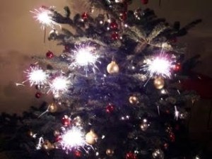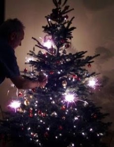 上の写真は、ツリーにつけた小さな花火に点火しているところです。