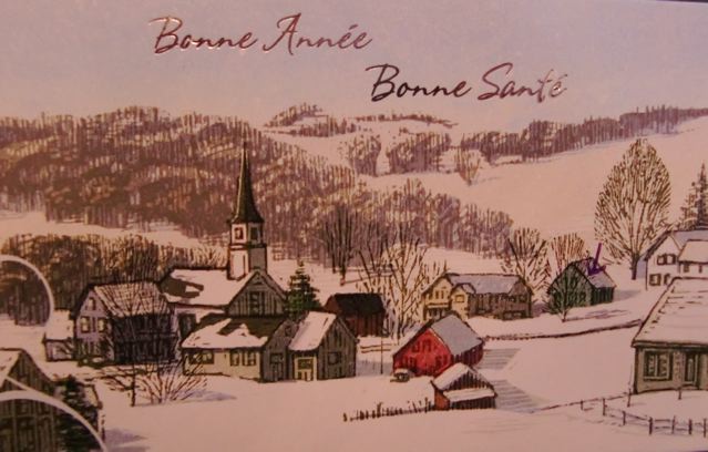 上の素敵なカードは、パリの友人Isabelleおばさんが「sachanとbernieの村はこんな様子?」と送ってくれたもの。