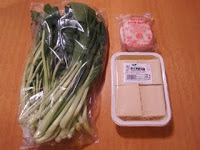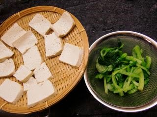 写真は小松菜をゆでたのと、豆腐も塩を入れた湯でさっと湯がいたところ。