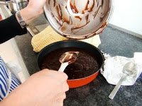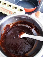 チョコとバターを混ぜて 湯煎で溶かしたところへ砂糖を入れる。