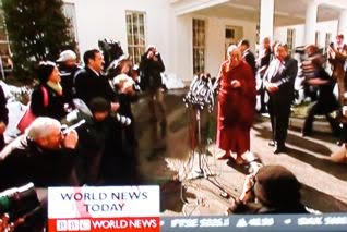 Sur l’écran de la télé BBC, Dalai Lama a l’air toujours aussi en forme malgré son âge et bien sûr que cette visite a sa signification importante sur le plan des relations diplomatiques internationales, le sort du peuple tibétain est quelque chose qui nous inquiète tous dans le monde entier…