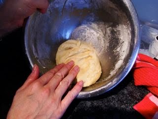 2)パイ皮の作り方 今回のはバター、小麦粉、砂糖、卵だけで、指示どおり捏ねてからまとめて1時間寝かせても、そのあと皿に広げるとき、ばらばらになって扱いにくい。