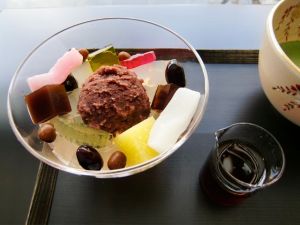 Princess-Kの大学院修了を祝って、京都散歩。京都の街歩きにもすっかり精通したPrincess-Kに連れられて、まずは「虎や」へ。素晴らしく清々しい庭園に面したテイールームで、あんみつをいただきました。