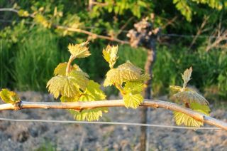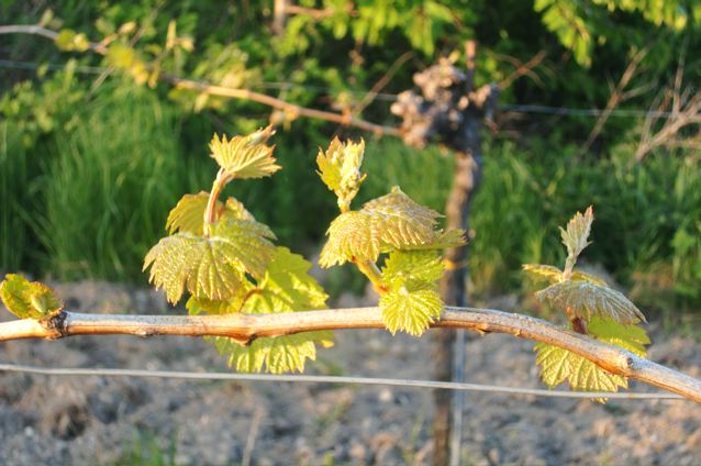 Maintenant les vignes ont commencé à pousser des feuilles toutes fraîches, très jolies et elles brillent au soleil qui se couche.