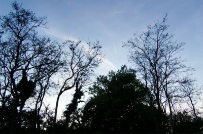 小鳥のねぐら。ずうっと上空には飛行機雲が。