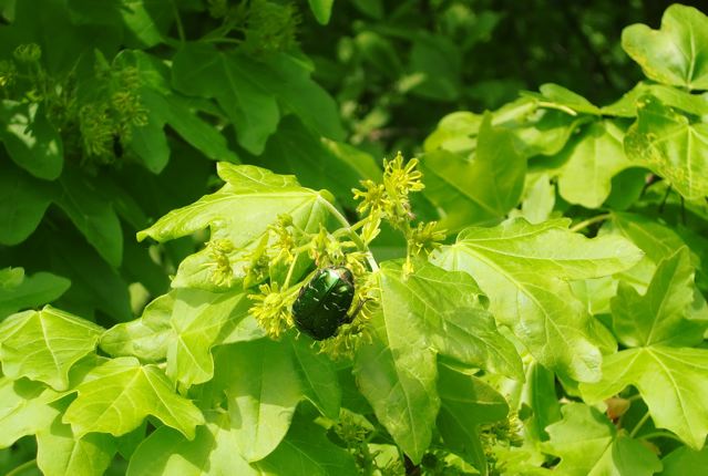 横道を入って葡萄畑の斜面の日向に出ると、カナブンもいたりと、生き物が元気に活動全開です。