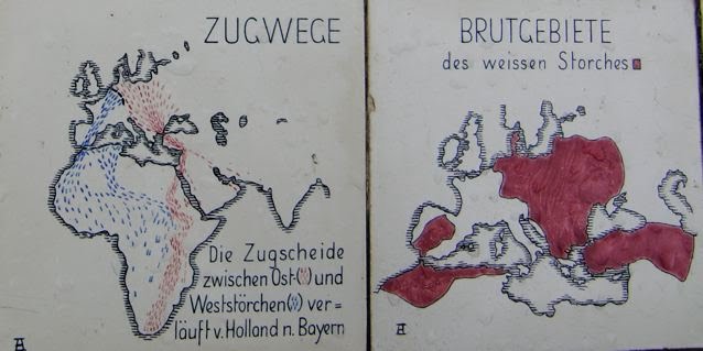 残り2つの地図は「渡りの経路」と「ヨーロッパでの白いコウノトリさんの分布図」だとわかります。Wegは「道路」wegeと複数になってるのはヨーロッパの西のほうに来るコウノトリさんたちはアフリカの西のほうへ(青いところ)、東のほうのコウノトリさんはアフリカの東のほうへ(アラビア半島も???)帰るんですね〜 ふむふむ。