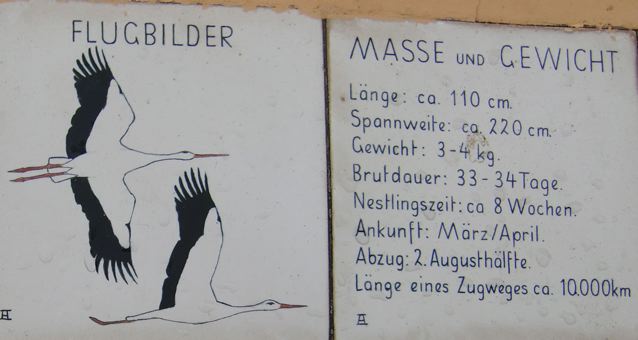 Bon, les cartes sont plus faciles à comprendre: ZUGWEGE (voies de migration) et BRUTGEBIETE (ça doit être les zones d’habitation des cigognes)…. J’avais vu dans mon dictionnaire allemand-français que ‘Zug’ signifie ‘migration’ pour les oiseaux et ‘Weg’ ‘la voie’, ‘les passages’… d’ailleurs on voit souvent ‘… weg’ sur les noms des rues.