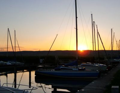 昨日は一日じゅう 肌寒くて雨まじりの大風がたたきつけていたけど、夕方になったら急に青空が広がって好転!おおおおっ天気が回復したぞ〜 窓から見ると、遠くの湖の水面が青くきれいな色・・・夕飯のすんだあと「散歩に行こうよ〜」と家人を引っ張り出してヨットハーバーのほうへ出かけました。