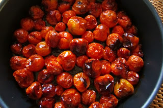 チェリートマトを並べた上から オリーブ油 大さじ3 に(なんと)砂糖 大さじ1 を混ぜたものをとろ〜りとかけて、150℃のオーブンで約1時間半 ゆっくり加熱(本には2時間半と書いてあるけど、1時間半でも上のほうが焦げそうになってたトマトもあったよ〜ん・・・ でももっと辛抱して2時間半 加熱したら、もっともっと とろとろになるんでしょうね きっと)