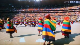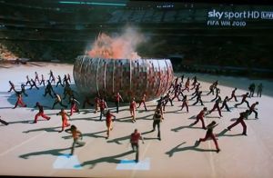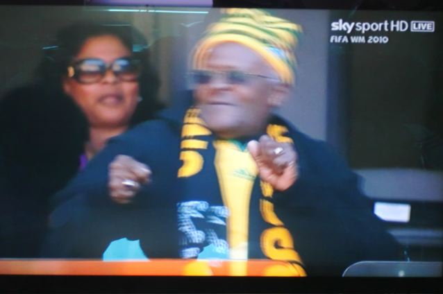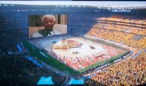 Dès 12h30, on s’est installés devant la télé pour regarder la cérémonie d’ouverture. Plein de couleurs, danses et de musique, un spectacle très joyeux, très sympa et plein d’énergie… et j’ai pris des photos de l’écran de la télé, comme si j’étais touriste au stade à Johannesburg!  On a vu le prix Nobel Desmond Tutu danser à plein tube, alors que  Nelson Mandela a apparu sur le grand écran…