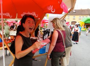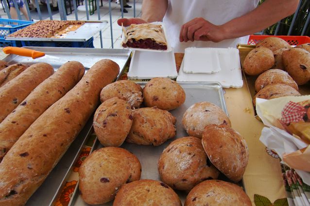 Après avoir fait le tour des stands, on a acheté du pain aux cerises (qui n’est pas sucré, imaginez-vous, il y a des morceaux de cerises dedans, qui rendent le pain un peu rosé, mais il y a aussi des poivres verts… parfait pour manger avec du fromage du chèvre, par exemple!) ainsi que des tartes aux cerises à la manière autrichienne (Strudel).