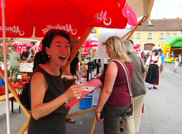 On a fait le tour des stands et je vois plein de gâteaux de toutes sorte… miam!  … mais il fallait tout de même acheter des cerises! … on en a pris 500g, de Donnerskirchen (le village de mon vélo!)  A la même occasion j’ai fait la dégustation de l’eau de vie de kirsch (pas mal du tout!) ;