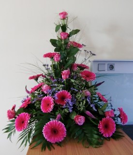 ...それにしても、このお花 すごく立派です。食卓に飾るのにはあまりにも幅も高さもあるので、招き猫ちゃんに一時お引っ越ししてもらって、カウンターのうえに飾りました。ここだと(ちょっと横が台所なのですが)うしろの壁がクリーム色なので、綺麗なピンク色がくっきり見えて、よく映えます。ガーベラなんて手のひらぐらいの大きさです。