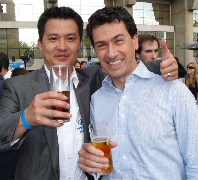 So I mentioned this to my host in Madrid – the handsome Carlos Lopez (you’ll see him in a photo here – nice, isn’t he ladies???) – and he invited me to the “Hyundai Fan Park” instead (can you guess who he works for???) …To see the ambiance, click here. Huge screens; 40,000 plus screaming Spaniards and all set up in the grounds of the Estadio Santiago Bernabeu – the home of Real Madrid and something akin to a cathedral for us (proud) hooligans! And what a night – the noise, the crowds, the excitement, the heat, the free drinks (VIP Morris! how classy …) and then Spain scored! Click here to see THE moment!!  And they held on as well to make the night complete for everyone. Not nice for the Portuguese of course – but there weren’t any of them there, so …