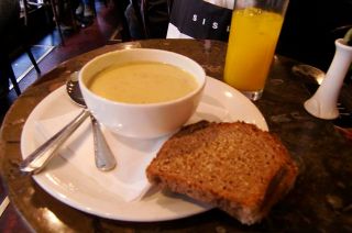 ランチがわりに注文したのが、このクラムチャウダー。ぼそぼその厚切りパン バターといっしょに来ます。