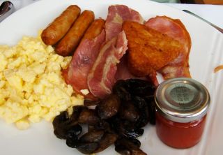 イギリス(アイルランド)スタイルのベーコンにソーセージ(ドイツやオーストリアのと全然違うんだ!!)、△のかたちはハッシュドポテト(細かく砕いたポテトをおにぎり型に焼いてある)、スクランブルドエッグ(これはホテルだから。普通なら目玉焼きがいいんだけどな)それにソテーしたシャンピニョン、トマトなど。