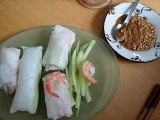 そんなわけで、ずうっと前に近くのスーパーMerkur(サムライライスと同じ売り場!)で買ってきたけど、「ふやかして使うって、どうやるのかなあ」と引き出しのこやしになっていた「ライスペーパー」を取り出して、お気に入りだけど今まで眺めて楽しむだけだったベトナム料理の本も取り出して、「生春巻」に挑戦☆