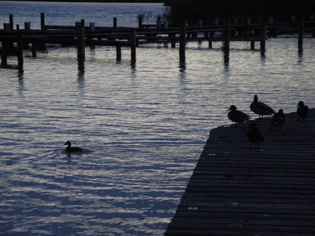 | Ces canards sont au moins aussi gros qu’un petit chat!! Incroyable… Il n’y a presque plus de bateau, alors ils ont tout l’espace pour eux. 暗くなりがかりでよく見えなかったけど、船着き場のところにカモが 集まっていました。近づくと がーがー大騒ぎ。 |