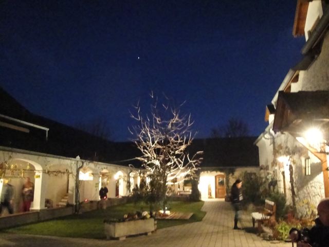 村の道を歩いていると、三々五々 友だち同士で歩いているグループや夕方の散歩に出たおばあさんとすれ違いますが、「お祭り」という言葉から想像するような賑やかさではなく、どちらかというと閑散としています。「ほんとにこんなに人が少なくてダイジョウブなのかしらん?」と心配になるぐらい。・・・でもそれは、人ごみに慣れている日本人的な感想だったのでした。なぜって 道から一歩入ると、酒蔵の中庭は別世界。いろんな飾りつけやロウソクの光や焚き火を囲んで座る場所もあったりして、幻想的な雰囲気です。