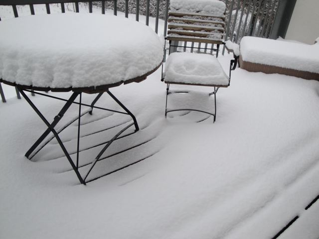 今朝は曇り空の雲のあいだから陽の光がのぞいて、昨日に比べるとお天気が少し上向きかな?・・・それでも起き出して外を眺めるとベランダはもうすっかり冬化粧。