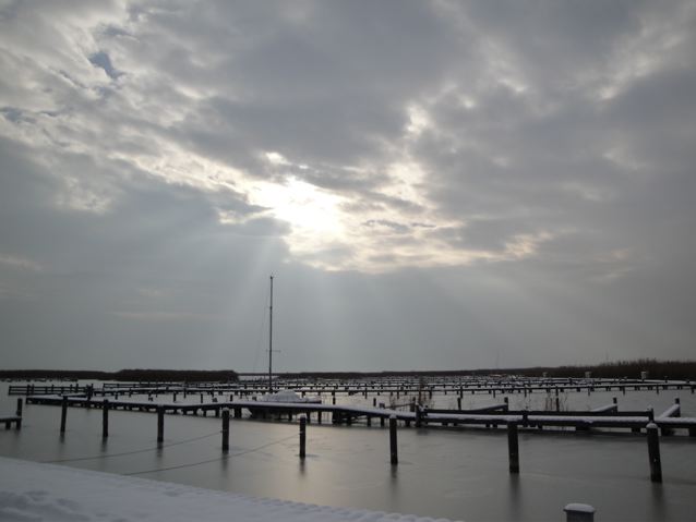 だ〜れもいない!!湖の水面 凍っていました!今年初めてです。・・・まだ表面が固まってるだけみたいだけど(オッシーさんは舟でスケートが待ち遠しいですネ)これじゃカモさんたちも泳げないから、ヨットハーバーはし〜んと静まりかえって、ほとんど神様の世界のようでした。