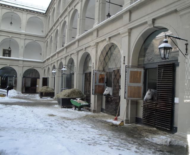 | En arrivant vers Hofburg via Albertina, on passe à côté de l’écurie impériale. Les très jolis chevaux blancs qui nous a dit bonjour… ホフブルグの横の道を歩いてたら、厩舎の中庭がお掃除中でした。 馬の姿が見えたのは初めてです。きれいな白い馬 ちょっと寒そう。 |