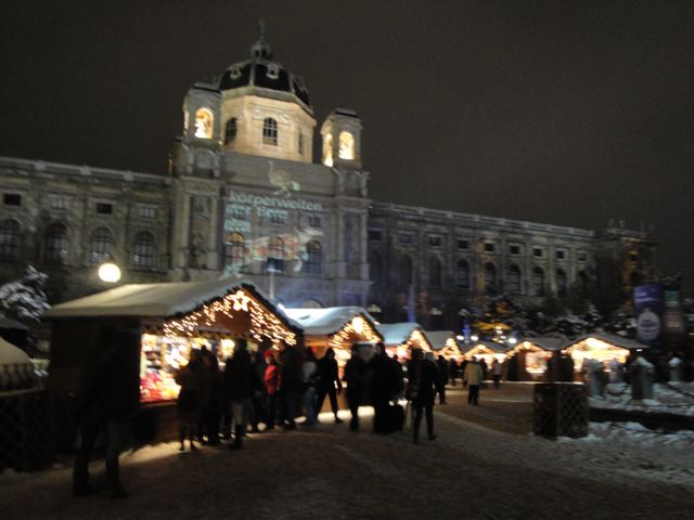 美術館が閉館になって外へ出てきたら、マリアテレジアの銅像のある広場のクリスマスマーケットがとても楽しい雰囲気!