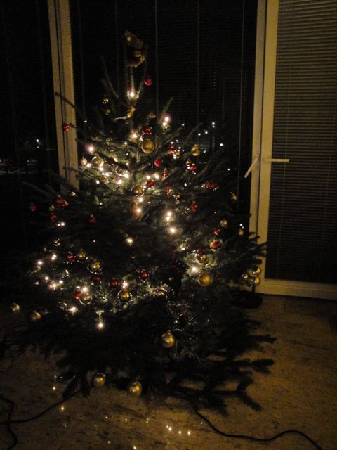 Le soir, j’ai fini de mettre toutes les décorations sur nos arbres et fenêtres… Un peu ‘art moderne’ cette fois-ci? Si on met des ailes, ces petits points dorés prendraient la forme d’un ange? … Ou bien je ferai un grand rond qui ressemblerait à une couronne? … je vais peut-être modifier, je suis encore en train de cogiter.