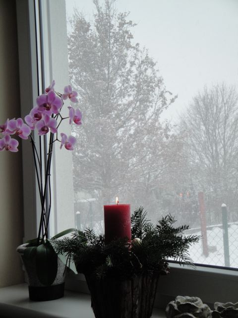 | Au petit déjeuner, j’ai allumé une bougie. 朝ごはんのとき 向かいのお家の角の木が 降りしきる雪でかすんで見えました。 チョット薄暗いので、キャンドルをつけました。 |