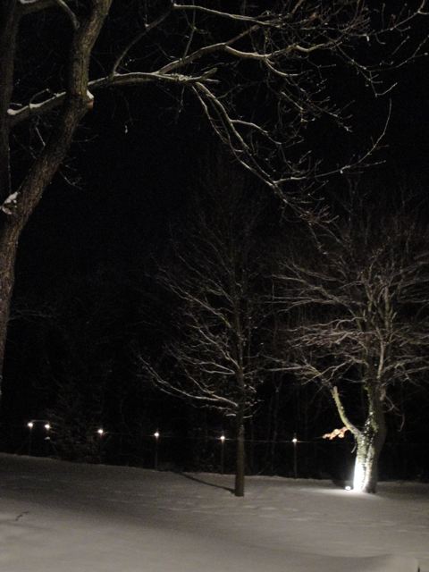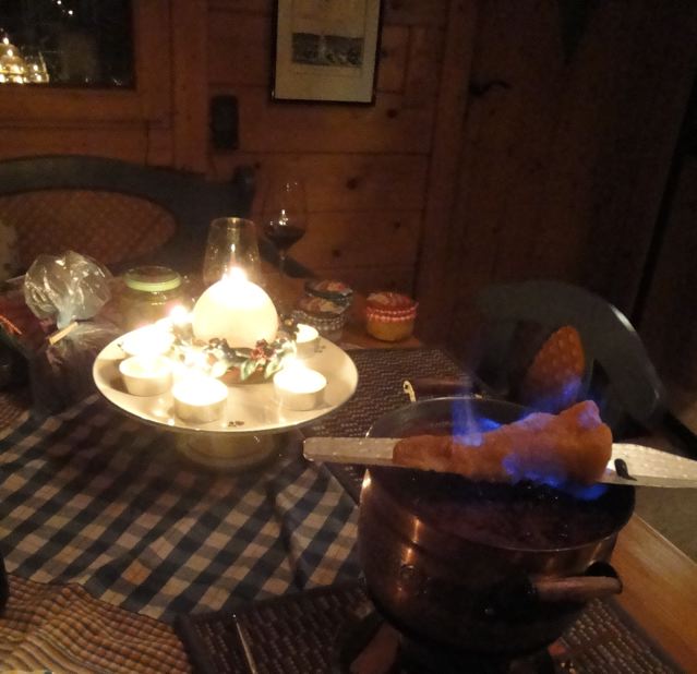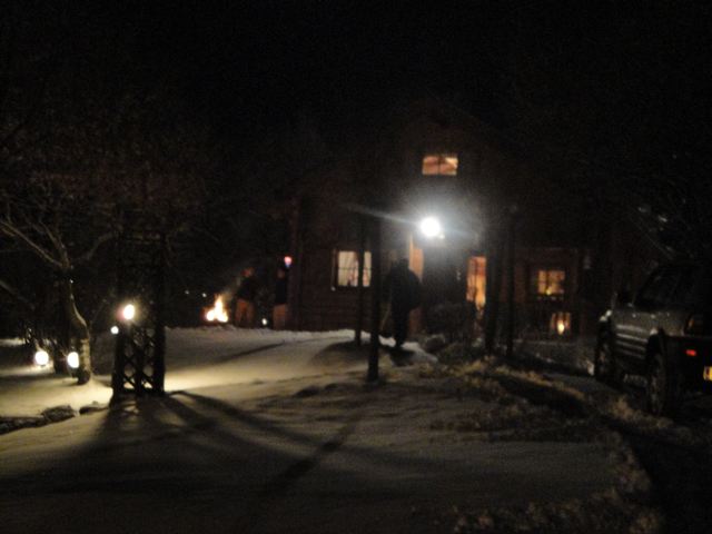 昨夕はオッシーさんの「テニスコート横の家」でワインとグルーワインと焚き火を囲むパーテイーがありました。ここは村のいちばん高台にある家で、オッシーさんはピアノを弾いたりテニスをしたり、静かに寛ぐとき、この家に来るそうです。なんと贅沢な!!周りは広い庭に囲まれていて裏は山なので、半分山のなかに入ったような感じです。高台だから夏はとても見晴らしが良いのですが・・・今夕は真っ暗。庭に点々と灯された電灯に雪をかぶった樹々が浮かび上がって、まるでクリスマスカードになりそうな雰囲気でした。