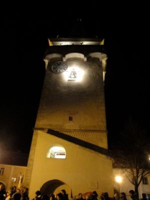 Beaucoup plus tard dans la soirée… vers 23h, Katrin et moi nous sommes toutes les deux parties vers la Tour Turque au centre de notre village. Il paraît que le groupe de ‘brass band’ du village va monter dans la Tour pour jouer de la musique. Chouette!!