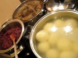 上の写真は25日のデイナー 牛肉にピクルスやら芥子を塗って巻いたのを赤ワイン味のソースで煮込んだ「ルラード」というお料理。「じゃがいも餅団子」みたいな「カルトーフル クヌードル」と赤キャベツの酸っぱい付け合わせといっしょに食べます。
