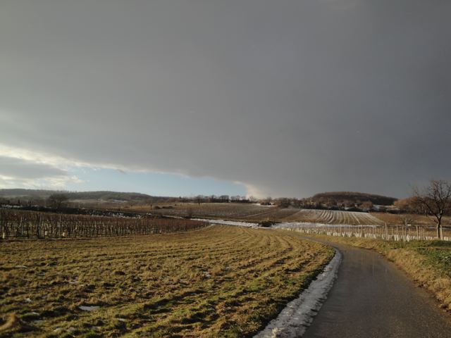 | Une grosse couverture de nuage gris avait l’air de se généraliser, mais…. 歩きはじめは雪のかけらがちらちら舞って、もっと寒くなってしまうのかなあ〜?と心配でしたが・・・ |